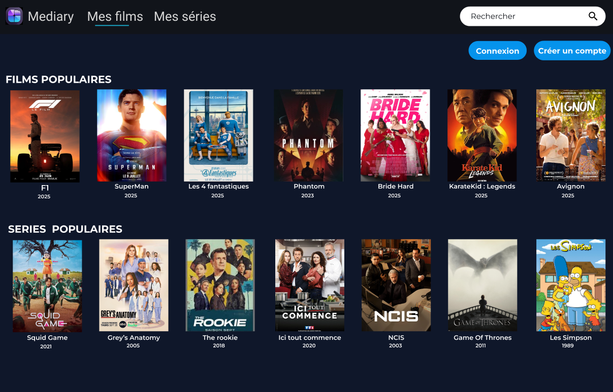 Mediary est une plateforme web inspirée de Letterboxd, conçue pour suivre et noter toutes ses activités culturelles : films, séries, livres, musiques, jeux vidéo.